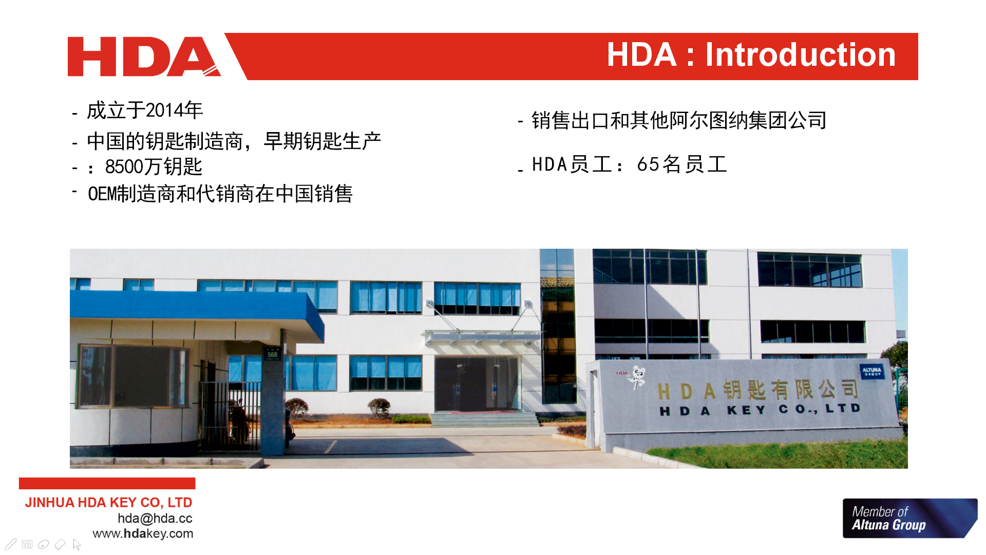 2005年,與歐洲三大鑰匙坯生產(chǎn)企業(yè)之一的西班牙JMA集團成立合資公司--金華HDA鑰匙有限公司。 2007年,轉(zhuǎn)為西班牙JMA集團獨資子公司。
